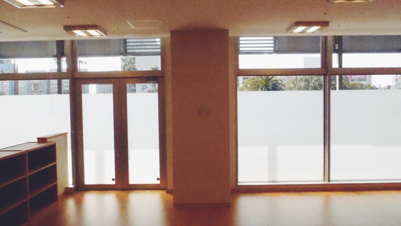 そのため、ガラス面は人の目線の高さを超える部分までは半透明のシート貼りとし、
