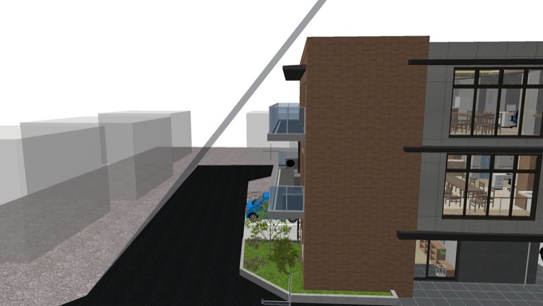 道路境界面の30%程度の間口が細くて高い建物では、