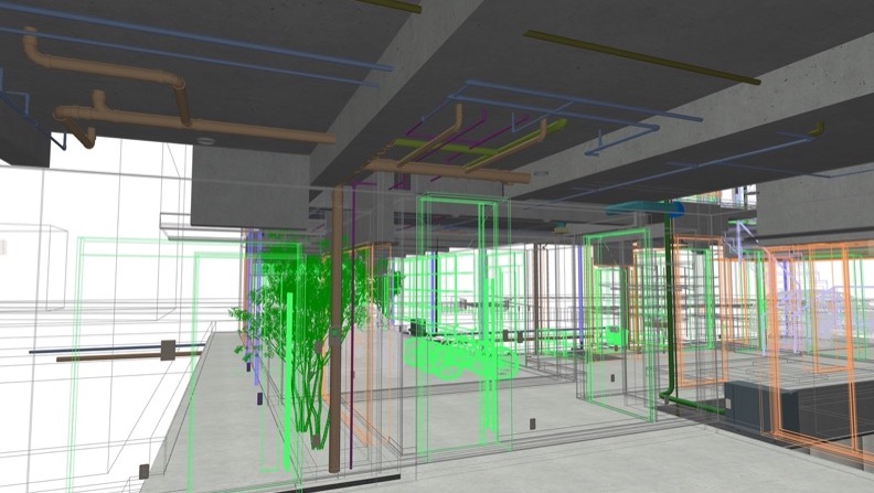 なので、構造モデルは意匠設計側で入力し、設備配管ルートとの干渉を確認しています。